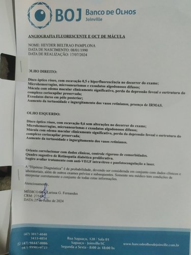 Meu whatsapp (47) 99144-5612 desde já agradeço e desculpe por tomar o tempo de vocês .Meu nome é Heyder Beltrão estou fazendo essa vaquinha pós preciso arrecadar no total de R$ 8.000,00 para procedimento cirúrgico ambos os olhos INJEÇÃO INTRA VITREO e laser , pós sou diabético a 15 anos e devido fiquei 3 meses com dengue e agora que omecei meu tratamento de insulina uso 56 unidades de insulina NPH e mas 4 unidades de insulina rápida, devido esse tempo veio agora a complicação da retinopatia diabética afetando minha visão não pododendo mas dirigir e nem trabalhar.