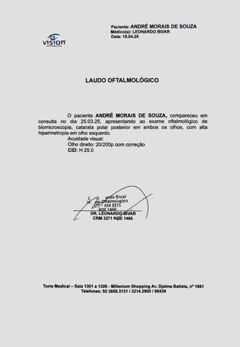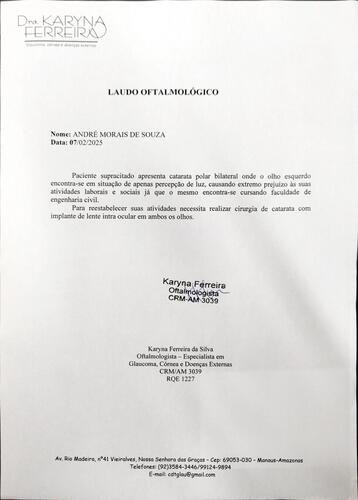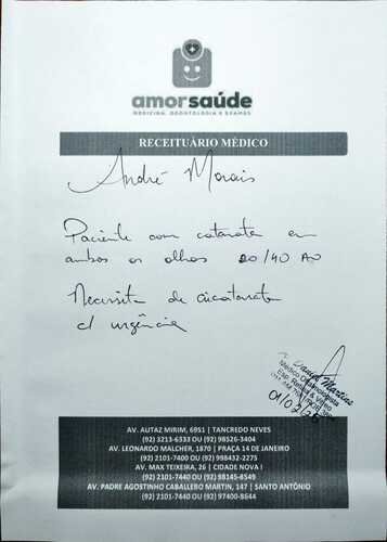 As consultas com especialistas revelaram que o André, atualmente com 44 anos, tem uma catarata diferente, ele é um ponto fora da curva, como diz a doutora Karyna Ferreira, especialista em Córnea, Glaucoma e Doenças Externas pela UNIFESP. De acordo com sua análise, André tem uma catarata bilateral que provavelmente lhe acompanha desde nascença e que por isso em idade jovem já apresenta quadro que se costuma ver em idades muito avançadas. Estando com pressão ocular alterada devido a catarata que está muito espessa, ele corre o risco de desenvolver glaucoma e por isso necessita urgentemente de uma cirurgia para que não venha perder a visão permanentemente. Assim como o Dr. Daniel Martins, especialista em retina e vítreo pelo instituto de oftalmologia IOM-AM e professor de residência do instituto de oftalmologia de Manaus, que afirmou que devido a gravidade da catarata, condições de fisiológicas e sua extensão, André necessita da cirurgia urgentemente.