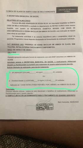 A Leucemia já está sendo muito bem tratada, mas a Retinopatia Diabética o SUS não fornece o medicamento para o tratamento e o custo é muito elevado.Necessito com urgência realizar a aplicação de 1 dose intravítrea por mês, durante 3 meses, em ambos os olhos para a estabilização da visão e acabar com o risco de perder a visão.
