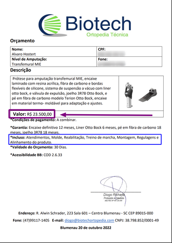 O orçamento atual tem validade de 30 dias (feito em 20/10/2022) e inclui, além da prótese em si, Atendimentos, Molde, Reabilitação, Treino de marcha, Montagem, Regulagens e Alinhamento do produto.
