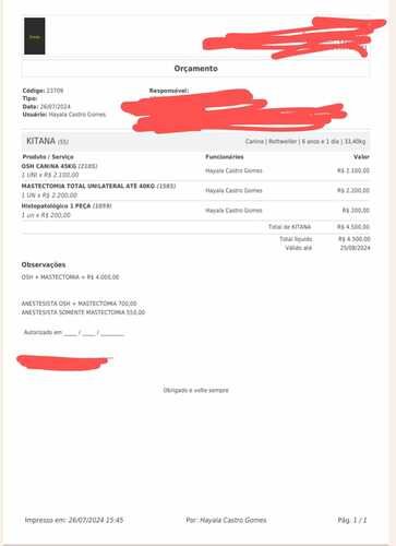 Pós-operatório: R$ 800,00 ( inclui antibiotico e antinflamatorio, troca de curativos feito pela veterinaria 2x em 15 dias, roupa pós cirurgica para ela não arrancar os pontos) é possível que o valor seja até maior, mas fiz com todos os descontos, inclusive com eu comprando o material para ela fazer os curativos ao invez de ultilizar da clinica que costuma ser mais caro.