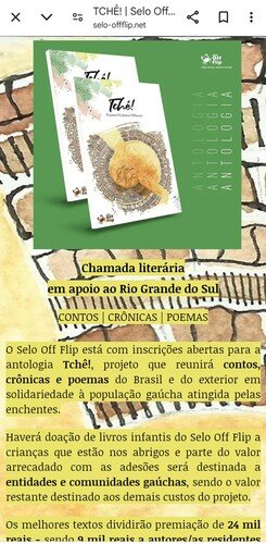 Olá! Meu nome é Gabriela dos Anjos, sou carioca, tenho 23 anos e faço letras na UERJ. Sempre gostei muito de ler e escrever. Meu conto foi selecionado para participar da antologia Tchê do Selo Off Flip. Sempre quis ser escritora, ter minhas histórias em um livro. Essa antologia terá crônicas, contos e poemas de diversos autores. Ela foi criada em apoio ao Rio Grande do Sul. Parte do valor arrecadado vai para comunidades gaúchas e entidades, o Selo Off Flip também fará doações de livros para as crianças. O lançamento vai ser em uma livraria em Porto Alegre e ela irá receber integralmente o valor das vendas . Eu quero muito ir, mas eu não tenho dinheiro para arcar com os custos da viagem. Eu quero muito poder estar lá e desfrutar do lançamento da antologia que terá um conto meu. Pra mim, isso é muito importante. Eu fico muito feliz de fazer parte dessa antologia e de finalmente ter o começo de um sonho se tornando realidade. Pra mim, a literatura é muito importante, ela mudou minha vida completamente, transforma a vida das pessoas. E é por isso que eu queria pedir para quem puder, me ajudar a conseguir o dinheiro da viagem para Porto Alegre, onde será o lançamento da antologia Tchê. Vamos apoiar a literatura nacional. Eu peço do fundo do coração que me ajudem. Desde já eu agradeço. Ajudem uma escritora iniciante a realizar esse sonho e poder estar presente num dia que será muito especial e importante para mim.