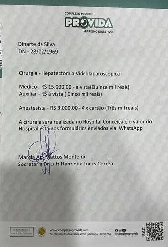 Dinarte da Silva, Pescador, 57 anos, nativo de Garopaba/SC neste momento vem carecidamrnte pedir a sua contribuição para que possa fazer uma cirurgia no dia 10/03/2026 as 7:30h da manha, com internação as 5h da manhã no Hospital Nossa Senhora da Conceição em Tubarão/SC. Cirurgião Dr. Luiz Henrique.Cirurgia: Hepatectomia por vídeolaparoscopia.Pois no final do mês passado foi diagnosticado com 2 nódulos no fígado e precisa urgentemente fazer essa cirurgia. O SUS tem o seu tempo e o caso dele não pode esperar.Dinarte é um Pescador humilde, sem condições financeiras, dessa forma, pedimos humildemdbte a sua ajuda para que possamos realizar essa cirurgia. Dinarte mora na Rua Geral de Ambrósio, Cidade: Garopaba/SC.Segue os custos para melhorar esclarecimento: