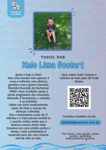 Por isso, essa vakinha foi criada. O objetivo é arrecadar os R$ 17 milhões necessários para o Elevidys e os cuidados essenciais que ajudam Kaio a continuar lutando com dignidade.