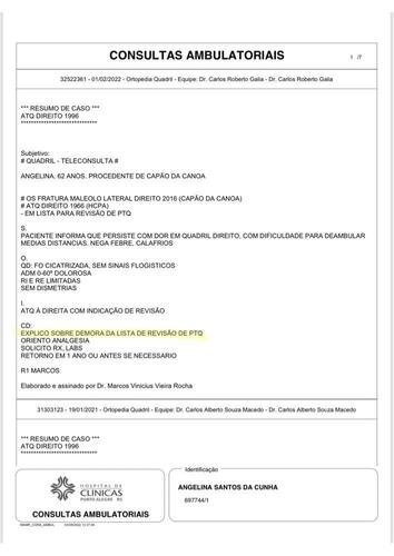 Nesta primeira cirurgia o sus cobriu todos os gastos, porém atualmente, ela já aguarda há 5 anos, desde 2007…E num período semelhante ela ficou viúva do querido Vô Toninho, desde então tem morado sozinha, o que torna tudo cada vez mais difícil com todas as limitações que as dores lhe causam.Somos moradores de Capão da Canoa, litoral do Rio Grande do Sul a 140 km de Porto Alegre, onde ela já realizou inúmeras consultas e aguarda na lista para cirurgia.Com a pandemia casos como o da minha avó ficaram mais de 2 anos sem chance alguma de acontecer, a única alternativa é usar medicamentos para dor até que não façam mais efeitos e precise de outro mais potente…Além das ligações e tentativas ao hospital, já recorremos a políticos, também fizemos ações entre amigos para arrecadação com ajuda de prêmios doados por conhecidos, reunimos todos os recursos, mas ainda insuficientes.Coloquei em anexo a foto do último laudo entregue a ela, onde está escrito “Explico sobre a demora da lista de revisão de PTQ” que o médico descreveu.PTQ é a sigla para Prótese Total Quadril que ela necessita, pelo que entendemos ATQ Artroplastia Total do Quadril é o nome da cirurgia em si.De fato sabemos que a cirurgia é simples e de grande sucesso em geral… Mas a dor que gera o desgaste, o peso sobre o osso, e a pressão que prensa a carne e os nervos da Vó Angelina é de arrepiar ao ouvir seus gritos de dor!Faz subir um frio na espinha e deixa sua mente em alerta como se você se sentisse em extremo perigo, não há como não se desesperar ao perceber que não há como aliviar a dor…Por isto estamos fazendo este pedido de grande socorro, para que você contribua com o valor que puder para a cirurgia da Vó Angelina!Sabemos que vamos vencer esta batalha, mas a pressa é porque a espera não tem sido nada fácil!Envie o quanto puder e o quanto tiver condições hoje, um pouco hoje será melhor que muito amanhã…