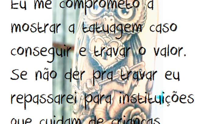 Confesso que não é algo tão necessário e que precisamos juntar forças sim para as coisas mais complicadas que acontecem pelo mundo. Mas me incentivaram, e no fim, pensei que não custa nada tentar. Quem sabe aparece uma tatuadora ou tatuador que faz mais em conta (Hehe). O valor que coloquei é o mais em conta que consegui e se eu não conseguir completar a "vakinha! eu me esforço para terminar. É que realmente estou sem um tostão furado para fazer qualquer coisa "a mais".Pode ser que não fique como no da foto porque acho que nem pode ser um "plágio", mas é só para ter uma noção de tamanho e detalhes.]Obrigada gente! Vou até divulgar no Facebook se conseguir! Rsrs!Abraços!
