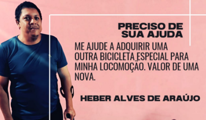 Tenho problemas de locomoção devido a um acidente que lesionou minha coluna. Impossibilitando minha coordenação motora normal. Minha bicicleta estragou mais uma vez, não tendo mais conserto. Desde já agradeço seu coração solidário. Ajude-me.