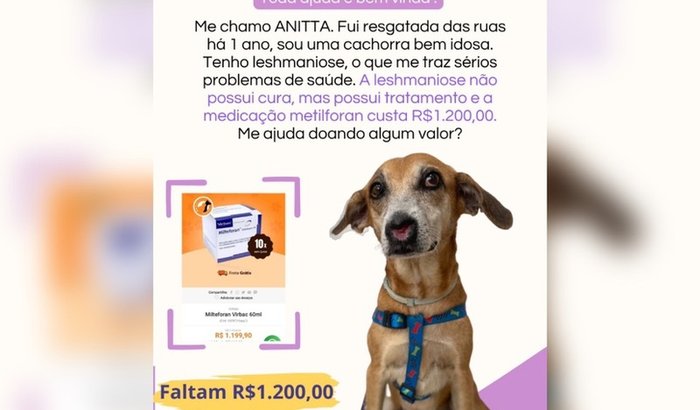 A anitta realizou a castração, após ser detectado um início de piometra(infecção no útero), e no ato da cirurgia de castração, necessitou retirar o BAÇO, pois o órgão estava tomado de lesões, causadas pela leshmaniose. E agora ela precisa fazer o uso de uma medicação chamada MITELFORAN, que custa no mínimo, R$1.200,00 + alguns exames, para diminuir a carga do vírus. Me ajuda a salvar a anitta?