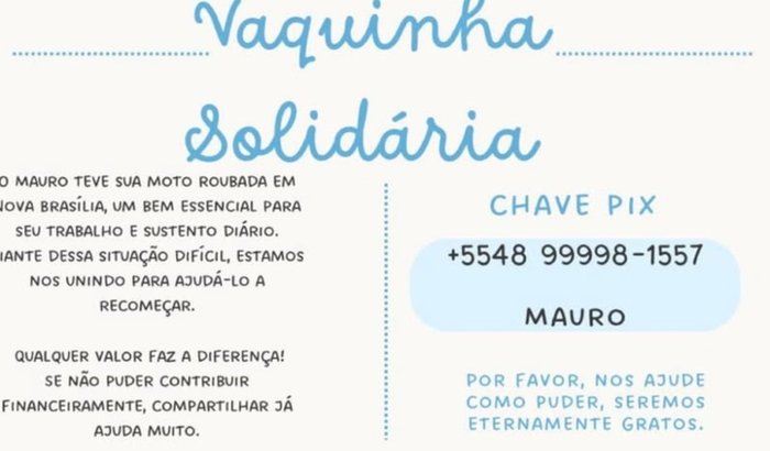 No dia 18/12/2025 às 05:30 da manhã ao acordar pra ir trabalhar vejo que minha moto foi furtada as 04:12 da madrugada, ela era meu bem material, que eu usava pra ir trabalhar e conseguir me manter, estou fazendo essa vaquinha pra conseguir arrecadar o máximo de dinheiro pra poder comprar outra, qualquer valor faz a diferença! Se não puder contribuir financeiramente, compartilhar já ajuda muito, serei eternamente grato.