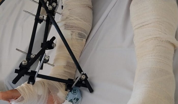 No acidente, quebrei as duas pernas — uma com fratura no calcanhar e a outra com fratura em quatro lugares. Estou internado no Hospital Marieta e precisarei passar por várias cirurgias e um longo período de recuperação.