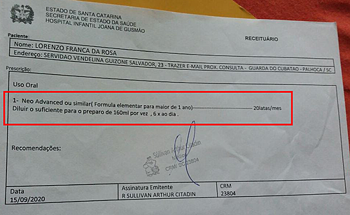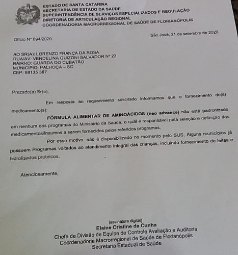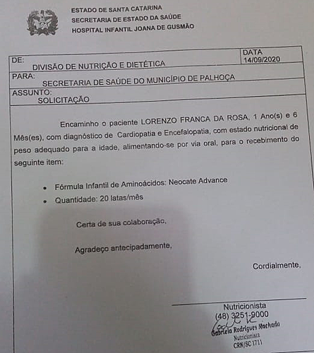 Lembrando que, conforme declaração em anexo, a Secretaria de Saúde do Estado informa que esse tipo de leite não é disponibilizado pelo SUS.