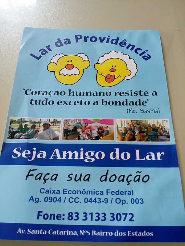 Solicito ajuda em favor do Lar da Providência em João Pessoa-PB, a instituição se encontra com sérios problemas financeiros para manter funcionando a estrutura e cuidando dos idosos que lá residem, atualmente o quadro de cuidadores está reduzido devido à pandemia que assola o mundo, e que esses cuidadores, a maioria são idosos.