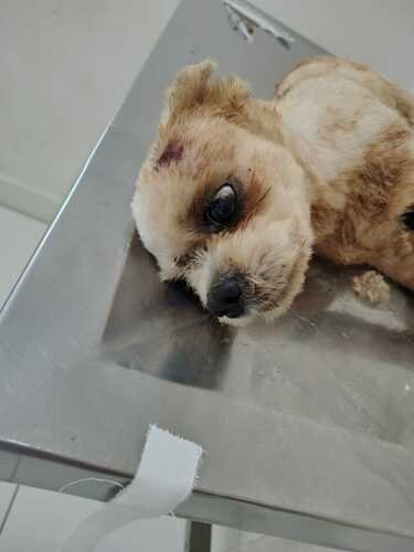 Pessoal, acabei de resgatar (23/12/24, 14h) este Shih Tzu atropelado na DF-473, próximo ao acesso para o Bela Vista. Ele estava muito machucado, e com sinais graves de trauma. Trouxe-o imediatamente para atendimento na veterinária.