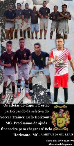 Os atletas do Cajui FC estão participando da seletiva do Soccer Trainer, Belo Horizonte- MG. Precisamos de ajuda financeira para chegar até Belo Horizonte- MG. Precisamos de 20mil para nossos 10 atletas.