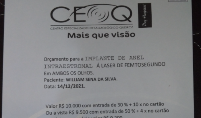 Criei essa vaquinha pois preciso arrecadar R$9.200,00 para um implante de anel intraestromal a laser femtosegundo em ambos os olhos.