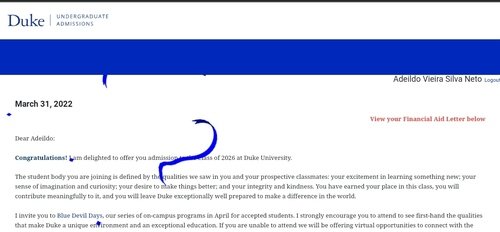 Eu sou o Adeildo Vieira, e fui aprovado no dia 31 de março de 2022 na Duke University (Universidade Duke), na Carolina do Norte - Estados Unidos.