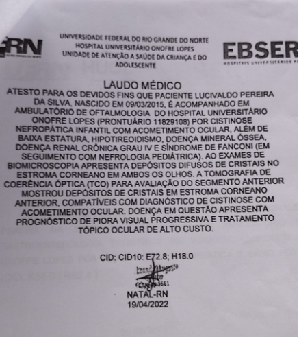 Doença genética rara caracterizada pelo acúmulo de cristais de cistina em todo organismo. Essa doença já afetou o meu crescimento, meus olhos, pâncreas, tireoide, músculos e meus rins.Faço uso de inúmeras medicações para minimizar as consequências da doença. Apesar do uso regular das mesmas, a doença está avançando e a minha função renal está comprometida, no momento faço hemodiálise 3 vezes por semana e aguardando alguns detalhes médicos para entrar fila do transplante.