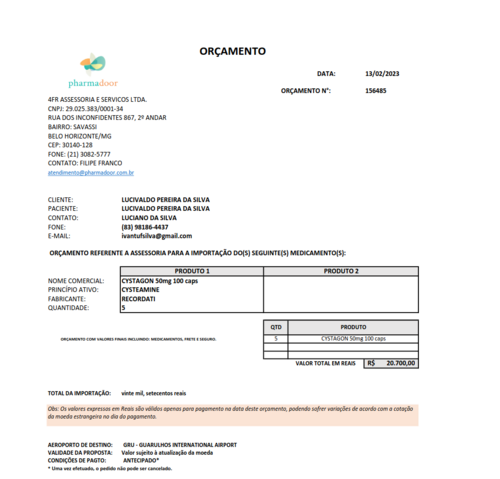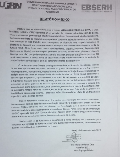 Necessito com urgência do Cystagon para frear o avanço da doença, e se tratando de uma medicação de alto custo não temos condições de arcar com o tratamento, por isso venho aqui pedir sua ajuda.
