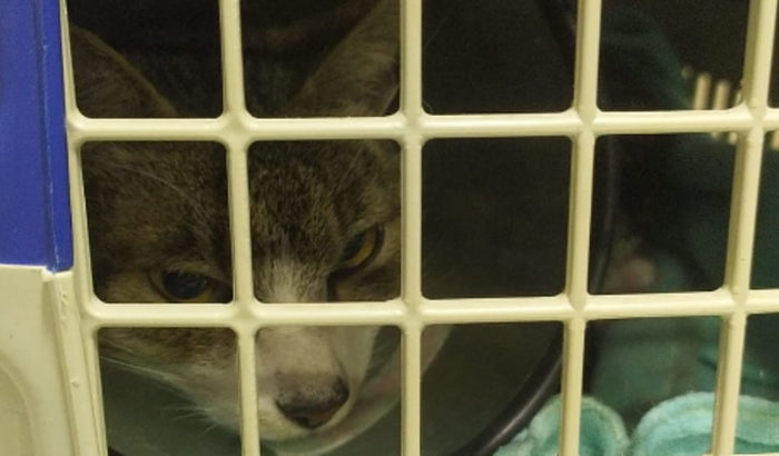 Esse gatinho foi encontrado na garagem do prédio, estava mancando, muito magro e com muito medo. Quando foi oferecida comida ele demonstrou muita fome e foi quando percebemos que sua pata esquerda traseira estava muito inchada. Conseguimos ver fios de cobre estrangulando a perna dele. Levamos ao veterinário onde receberá todos os cuidados, os fios estavam tão apertados que quando foi retirado seu osso estava exposto.