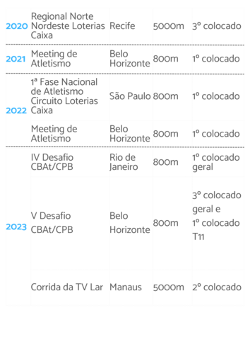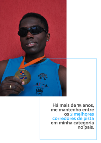 Participo das mais importantes corridas nacionais e, atualmente, ocupo 1º colocação de melhor atleta paralímpico do Brasil na prova de 800 metros, classe T11 no ranking nacional. Atuo também em escolas e organizações, sensibilizando sobre a inclusão das pessoas com deficiência e a importância do esporte paraolímpico.