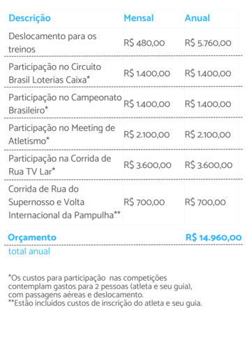 Mas, para tudo isso, preciso da sua ajuda! Essa prática profissional demanda uma série de custos com treinadores, guias (ou chamadores), materiais e equipamentos específicos, além dos custos de inscrição e viagens para as competições. Veja os gastos previstos para o ano de 2024: