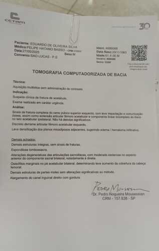 Olá, meu nome é Eduardo de Oliveira Silva, tenho 62 anos e trabalho como eletricista autônomo em Santa Bárbara D’Oeste (SP). No dia 27/05/2025, sofri um grave acidente ao cair de três metros de altura enquanto descia uma escada. O impacto resultou em fratura no quadril e complicações no joelho, deixando-me impossibilitado de exercer minha profissão.
