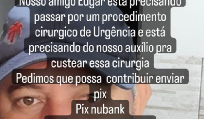 EU EDGAR ESTOU CRIANDO ESTA VAKINHA PORQUE PRECISO FAZER UMA CIRUGIA O CUSTO DELA FICA ENTRE 18000,00 AGRACO QUEM PODER AJUDAR MUITO OBRIGADO, ver tudo