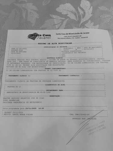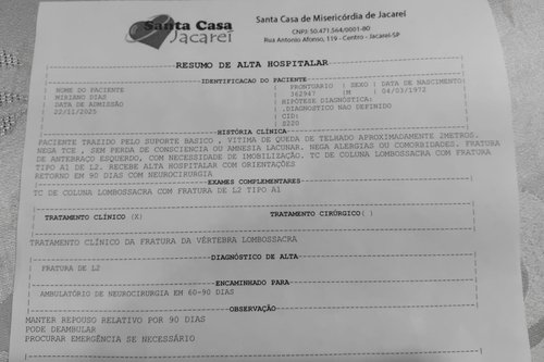 Me chamo Miriano sou prestador de serviço autônomo , a 10 dias, realizei um trabalho social, oferendo meus serviços de pintura pra ajudar uma família a ter um Natal melhor .Neste trabalho social voluntário fiz a pintura de uma casa já finalizando o trabalho ao final do dia sofri uma queda do telhado, onde fraturei braço esquerdo e a coluna.