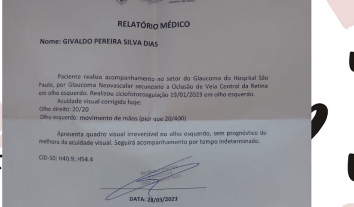 Eu sou Givaldo Pereira Silva Dias,fui diagnosticado com Glaucoma Neovascular secundário a oclusão de veia central da retina em olho esquerdo.