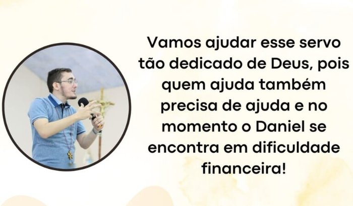 Daniel Silveira é um missionário que trabalha para Deus, pregando em todo o país. Ele não cobra nada pelas pregações, e assim vai evangelizando muitas pessoas e multiplicando os talentos que Deus o deu. Além de distribuir cestas básicas mensalmente com as doações que recebe especificamente para isso. Mas por diversas situações que atualmente aconteceram em sua vida, ele se encontra em dificuldades financeiras, mas nunca deixou isso atrapalhar a missão, mas quem ajuda muito ao próxima também merece ser ajudado e cada um doando um pouco, se torna muito !