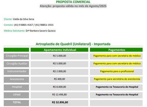 Neste valor estão inclusos: Cirurgiões (principal e auxiliar), instrumentador, anestesista, hospital e a OPME (Órteses, Próteses e Materiais Especiais).