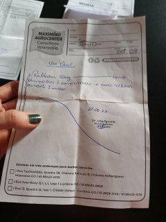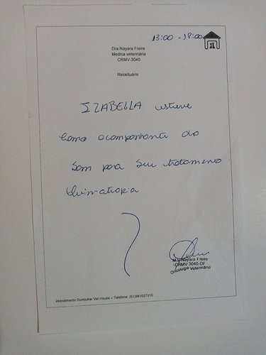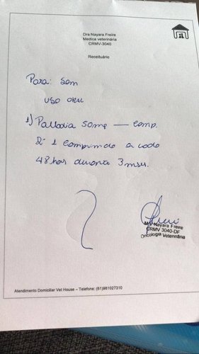 Fotos de algumas receitas da oncologista veterinária solicitando o tratamento com o Palladia e atestado quimioterapia