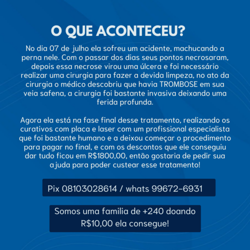 Então pessoal, no dia 07 de julho sofri um acidente, machuquei a perna nele. Com o passar dos dias meus pontos necrosaram, depois essa necrose virou uma úlcera e tive que realizar uma cirurgia para fazer a devida limpeza, no ato da cirurgia o médico descobriu que eu estava com a veia safena trombosada e então a cirurgia foi bastante invasiva e fiquei com uma ferida profunda.