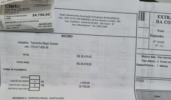Nós seus filhos cobrimos os custos iniciais de 4 dias (37 mil reais) de internação particular em UTI para que ela pudesse se recuperar e fazer os exames. Mas infelizmente esse tempo não foi suficiente para ela atingir a recuperação necessário para poder fazer angiotomografia com contrax e posterior operação.