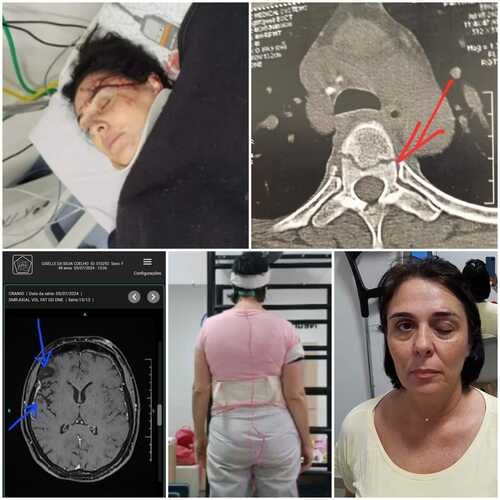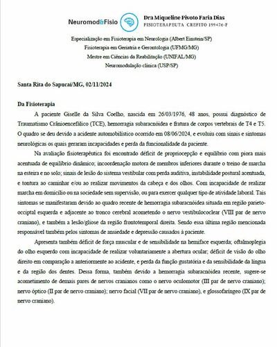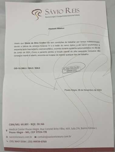 . Fratura na coluna torácica em T4 e T5. TCE (traumatismo crânio encefálico) moderado, com lesão cerebelar esquerdo, com paresia do nervo óculo motor esquerdo, pálpebra fechada a esquerda e pupila ipsilateral midiáticaAbaixo alguns laudos para comprovar: