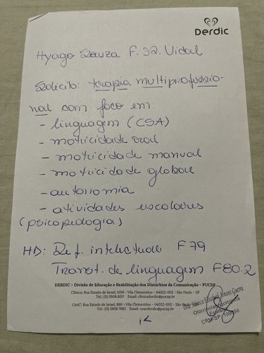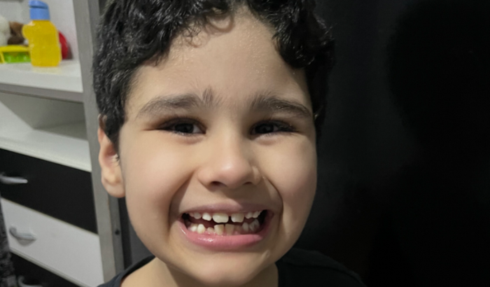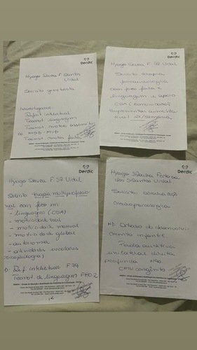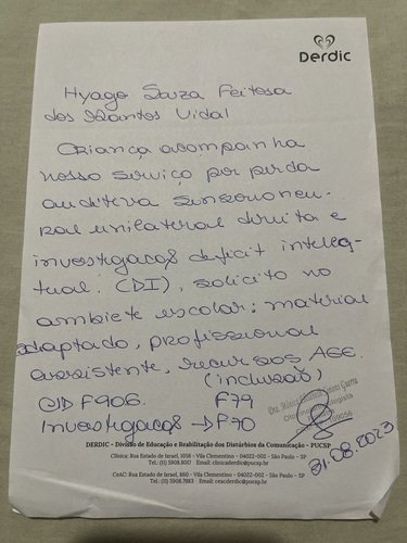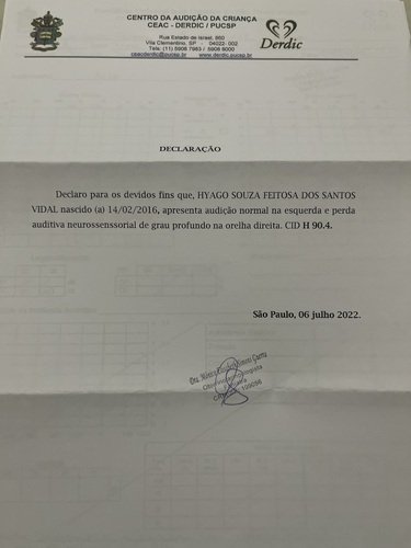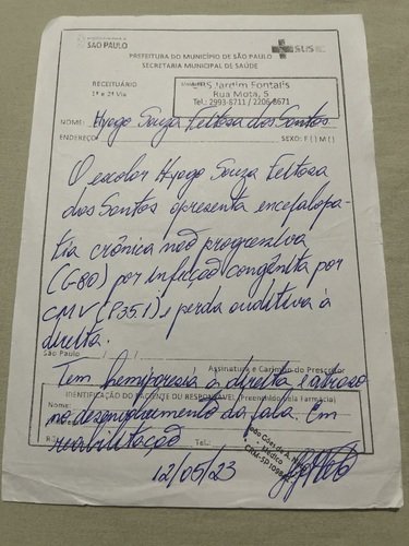 Meu filho Hyago tem paralisia celebral e perda auditiva do lado direito, por conta do citomegalovírus. E tem déficit intelectual também. Afetou o lado motor dele, a fala e o ouvido direito, por isso ele tem que usar aparelho auditivo. E por conta disso preciso comprar um aparelho auditivo novo, pois o que ele tinha caiu no chão e o cachorro da vizinha mordeu e quebrou.