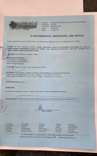 O mioma está crescendo muito rápido porque o meu sangramento é muito intenso e o sangue faz com que ele cresça e desenvolva com muita rapidez, pois já está quase uma gestação de cinco meses empurrando o intestino e o útero que aumentou de tamanho.