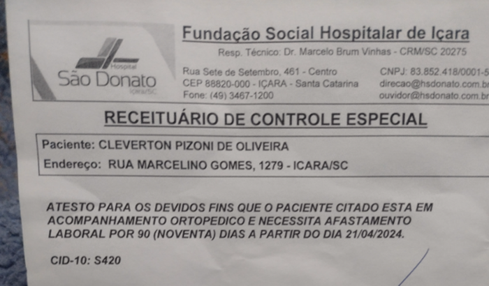 Olá. Meu nome é Cleverton pai de família com 5 dependentes de mim como todo mundo sabe. Tive um acidente e quebrei a clavícula; sou motoboy e preciso de ajuda. Favor quem puder ajudar sou bem conhecido no balneário rincão. Agradeço qualquer ajuda desde dinheiro ou alimentação. Tenho 5 filhos em casa todos dependentes de mim pago aluguel e todas contas praticamente sozinho. Minha esposa cuida de um de meus filhos que é especial. Qualquer ajuda será bem vinda!