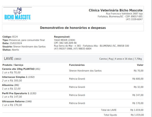 R$1.270,00: Cerenia, 2 internações, albumina, perfil pré-operatório, ultrassom.