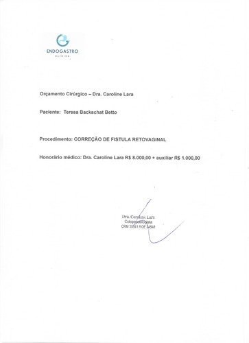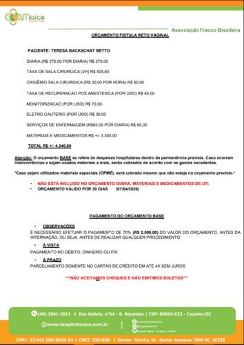 Desde novembro, ela vem sofrendo com dores intensas e uma situação extremamente delicada. Após exames e avaliação médica, descobrimos que ela está com uma fístula retovaginal, um problema grave que só pode ser resolvido com cirurgia.