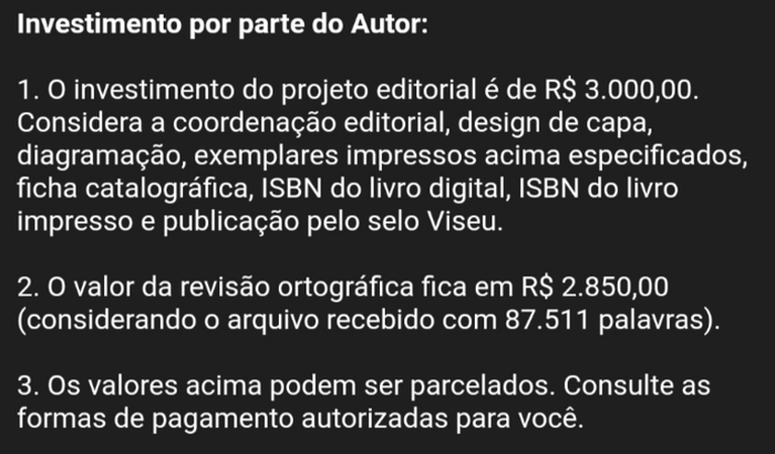 Contudo, isso exige um investimento de minha parte e que por sinal é alto, mas com motivo, já que o processo para a criação de um livro físico é complexo e exige trabalho. E, mesmo que eu tenha um trabalho, não consigo pagar pelo investimento de 5.850,00, pois uso o que ganho com gastos pessoais e familiares.