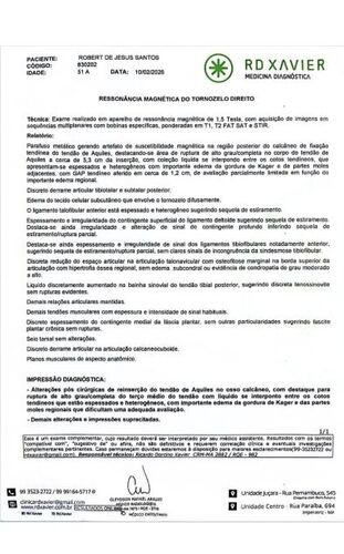No dia 20/10/2025 sofri um acidente onde ocasionou no rompimento total do Tendão de Aquiles, depois da cirurgia tive complicações e ainda após isso, no dia 05/02/2026, sofri uma queda onde a situação piorou...Conforme descrição da Ressonância abaixo: