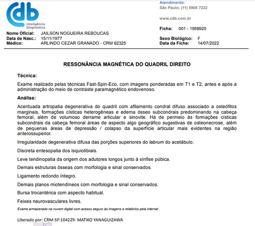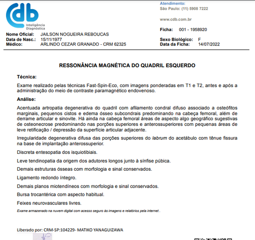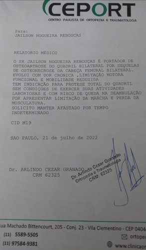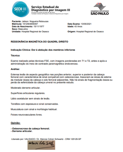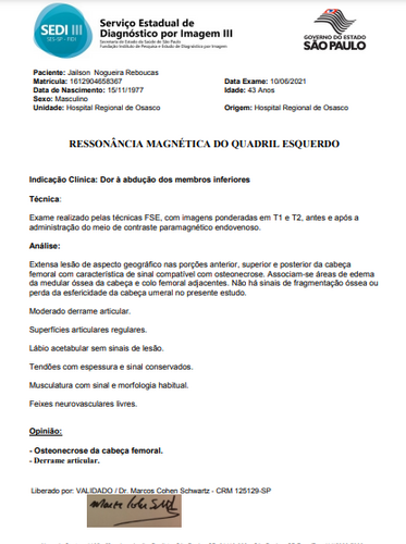 Meu nome é Jailson Nogueira Rebouças, fui diagnosticado, em 10/06/2021, como portador de osteonecrose do quadril bilateral por sequelas de osteonecrose da cabeça femoral bilateral.