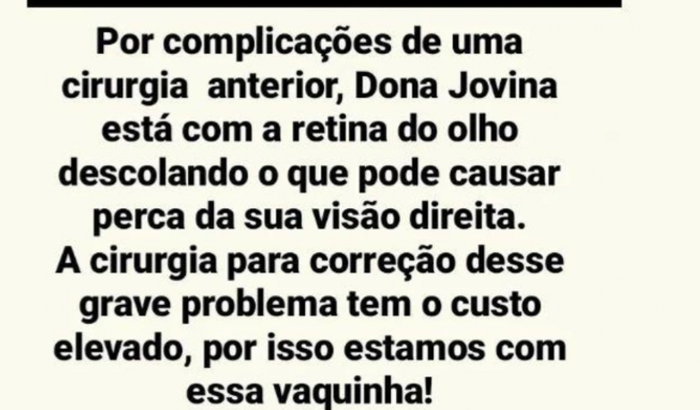 Boa tarde! Por complicações de uma cirurgia anterior, Dona Jovina ( minha mãe de 71 anos)está com a retina do olho direito descolando o que pode causar cegueira irreversível. A cirurgia para correção desse grave problema tem o custo elevado, e infelizmente não conseguimos a ajuda da prefeitura, por isso estamos criando essa vakinha pois a cirurgia é urgente, cada dia que passa é uma chance a menos dela recuperar um pouco da visão. Conto com a ajuda de cada um de vocês, desde já agradeço do fundo do coração 💓🙏