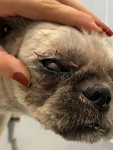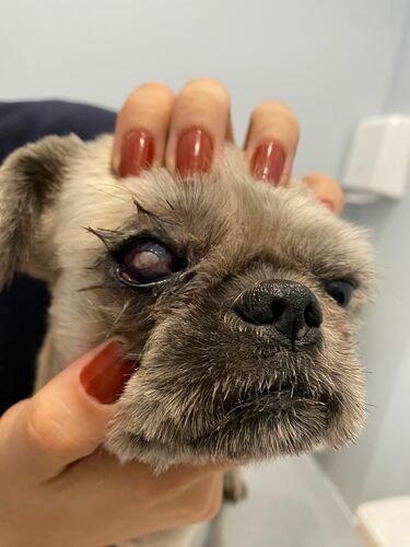 Ontem ao chegar em casa vi que o meu Shitzu estava com o olho direito diferente. No desespero levei ele em uma clínica Veterinaria daqui de Rio Claro. O Bob passou por avaliação e foi diagnosticado com uma perfuração no olho direito. Foi medicado com 2 injeções para dor e foi indicado ser caso cirúrgico de emergência para ele não perder o olho e a visão.