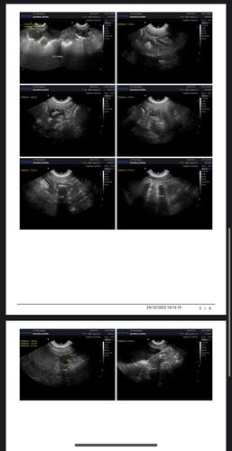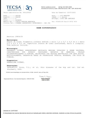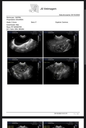 Alguns meses atrás realizamos exames e biópsia que teve como resultado hemangioma, um tumor benigno que poderia virar um tumor maligno chamado emangiossarcoma. Como são vários nódulos pelo corpo dela, existia chance de algum deles já ser maligno. Então nossa saída era fazer outros exames para poder começar uma eletroquímio, porém na ultrassom encontramos uma neoplasia de 14cm na parede do estômago, cisto no ovário esquerdo e pancreatite.