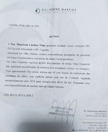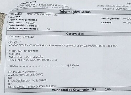Desde então, durante esses 20 anos, venho sentindo constantes dores que são levemente amenizadas com a utilização de medicação e também realizando diversas cirurgias, todas sem sucesso. Assim, decorrente de minhas condições, foi solicitado pelo meu médico, Dr. Guilherme Martins, a realização urgente de uma cirurgia de evisceração em meu olho esquerdo, que se trata da remoção e substituição do olho por uma prótese.