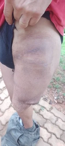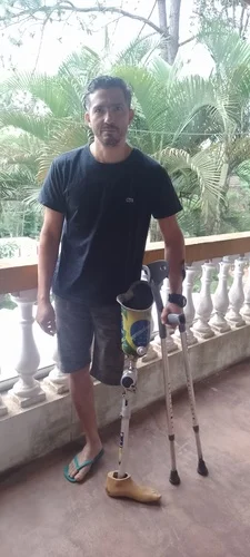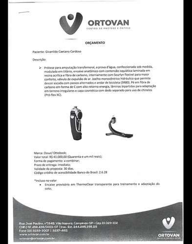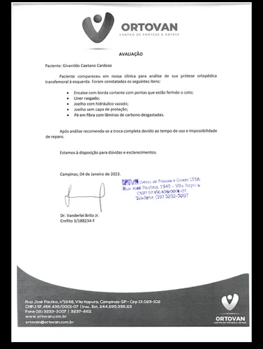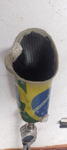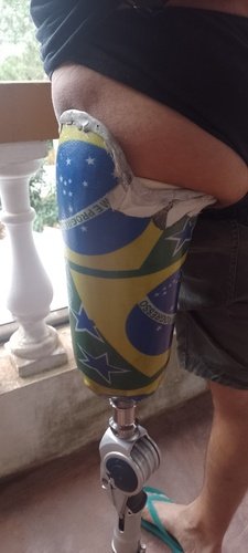 Esta prótese da foto está com o joelho estourado e o sistema hidráulico das outras peças entraram em colapso já fazem mais de 4 anos impossibilitando o uso frequente sem que cause desconforto, machucados e tombos. Existe uma lesão na lombar devido a diversos tombos e marcha errada causado pela prótese que não esta mais freiando .
