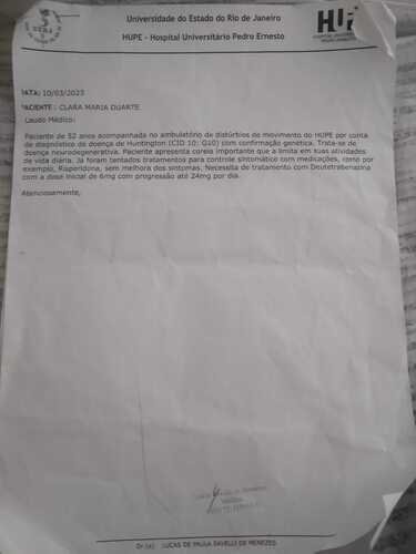 Meu nome é Clara Maria, tenho 52 anos e em 2019 fui diagnosticada com a doença de Huntington - uma doença rara, hereditária, sem cura e sem tratamento específico, existindo apenas um remédio para controlar a coréia (os movimentos involuntários causados pela doença) chamado Austedo (deutetrabenazina) podendo custar até 50.000,00 reais. Moro sozinha com minha filha Sara de 17 anos que estuda o dia inteiro, e preciso de ajuda para comprar o remédio, uma cadeira de rodas para me locomover na rua porque cada dia está mais difícil, e ajuda para outras coisas como pagar um salário mínimo para minha cuidadora, pagar viagem de carro de aplicativo para ir até ao Rede Sarah que é um hospital de neurorreabilitação na Barra e eu moro em Brás de Pina, ir de ônibus me deixa extremamente cansada, é muito sacrificante. Perdi meu irmão Luiz Carlos em abril do ano passado pela mesma doença, peço muito sua ajuda para que eu tenha os melhores cuidados para não piorar. Desde já agradeço sua atenção!