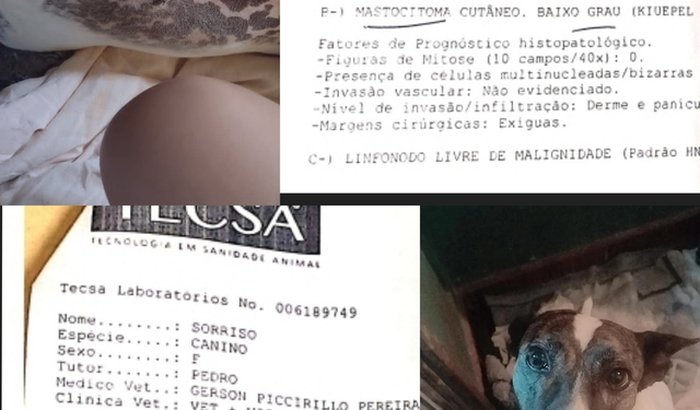 Ha quatro anos atrás ,essa cachorrinha acompanhou minha filha e sua amiga próximo a um hospital da cidade.Essa mesma amiga da minha filha a pegou e levou para casa para cuidar dela, mas um tempo depois ela precisou se mudar e na casa atual não aceitam nenhum pet ,ai eu e minha esposa a adotamos e trazemos ela pra casa junto de mais outros seis cachorros também tirado das ruas ,colocamos seu nome de sorriso pois ela sorri ao falar com ela,mas nem sempre ela foi assim pois tinha medo de carro e cabo de vassoura e não latia ,acredito que foi maltratada no passado e também acredito que foi atropelada pois não tem uma das patas traseIra ,mas com carinho ela foi voltando a confiar nos humanos ,se já não bastasse todo o sofrimento anterior ,foi diagnosticada com cancer de pele , foi feito uma cirurgia para retirada das peles afetadas pelo câncer e feito biopsia dos tumores mas infelizmente deu maligno e com isso agora precisa fazer um tratamento para ver se acaba com o câncer que se chama eletro quimioterapia.